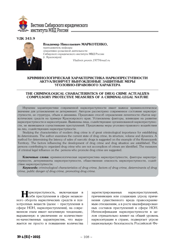 Наркопреступность, включающая в себя преступления в сфере незаконного оборота наркотических средств и психотропных веществ (далее – преступления в сфере НОН, наркопреступления), на современном этапе имеет негативную тенденцию, выраженную в увеличении ее количественно-качественных характеристик, что выражается не просто в повышении количества зарегистрированных наркопреступлений, причиняющих или создающих угрозу причинения существенного вреда правоохраняемым отношениям, а в росте квалифицированных составов преступлений в сфере НОН. Интенсификация наркопреступности в целом отрицательно влияет на общий уровень наркоситуации в стране, подвергает угрозе национальную безопасность Российской Фе- дерации, в частности порождает вовлеченность множества лиц в незаконный оборот наркотиков.