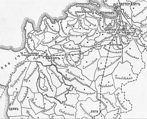 Рис. 2. Фрагмент карты волостей С.-Петербургской губер-нии19. Красной линией обведены четыре волости, составлявшие «страну сомряков», – Доложская, Ложголовская, Осьминская и Старопольская. Желтой линией обведены Выскатская и Добручинская волости (расширенное понимание «страны сомряков»)