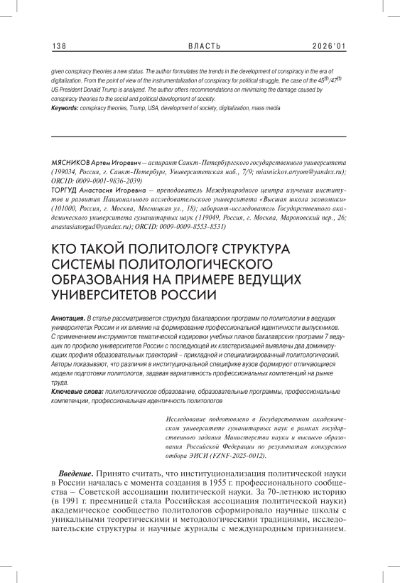 The article examines the structure of bachelor's political science programs at leading Russian universities and their implications for the formation of graduates’ professional identity. Employing thematic coding methodology, authors analyze curriculum structures of seven top-ranked Russian universities, categorizing academic disciplines into distinct blocks including theory, methods, applied political science, and specialized political science disciplines. The research employed k-means clustering analysis, revealing two primary educational clusters. The study reveals that Russian political science education operates through a dual model responding to both academic community demands for fundamental training and labor market requirements for specialized practical skills. Universities with strong theoretical traditions prioritize research competencies and expert knowledge production, while institutionally specific universities orient toward government service and political consulting careers. As a result, although political scientists possess similar theoretical foundations, their professional competencies differ significantly based on the institutional characteristics of their educational programs. This diversity indicates political science education's adaptability to different labor market demands, from academic to governmental-administrative sectors. The research concludes that current differentiation represents an adaptive response rather than a systemic problem. Thus, the prospects for future development include legitimizing this diversity while upholding theoretical rigor and ensuring practical applicability. These findings enhance the understanding of how educational content shapes professional identity within contemporary Russian political science education.