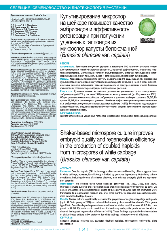Актуальность. Технология получения удвоенных гаплоидов (DH) позволяет ускорить селекцию гомозиготных линий у белокочанной капусты, однако её эффективность ограничена генотип-зависимостью. Оптимизация условий культивирования, включая использование платформы-шейкера, может повысить выход и регенерационный потенциал эмбриоидов. Методы. Исследованы три генотипа капусты белокочанной (№ 2502, 2503, 2504). Микроспоры культивировали в стационарных условиях и на шейкере (40–50 об/мин). На 30-е сутки оценивали стадии развития эмбриоидов; далее их переносили на среду регенерации и через 3 месяца фиксировали успешность регенерации в полноценные растения. Результаты. Культивирование на шейкере достоверно увеличивало долю семядольных эмбриоидов (до 81,7 % у генотипа 2502) и снижало частоту аномалий (до 0 % у генотипа 2503). Общая регенерационная способность эмбриоидов в условиях шейкера составила 30,5 ± 5,4 % против 19,2 ± 2,8 % в стационарных условиях. Наиболее эффективно регенерировали семядольные эмбриоиды, полученные с использованием шейкера (36,5 %). Результаты подтверждают целесообразность внедрения шейкера в DH-протоколы капусты белокочанной с целью повышения ее эффективности.