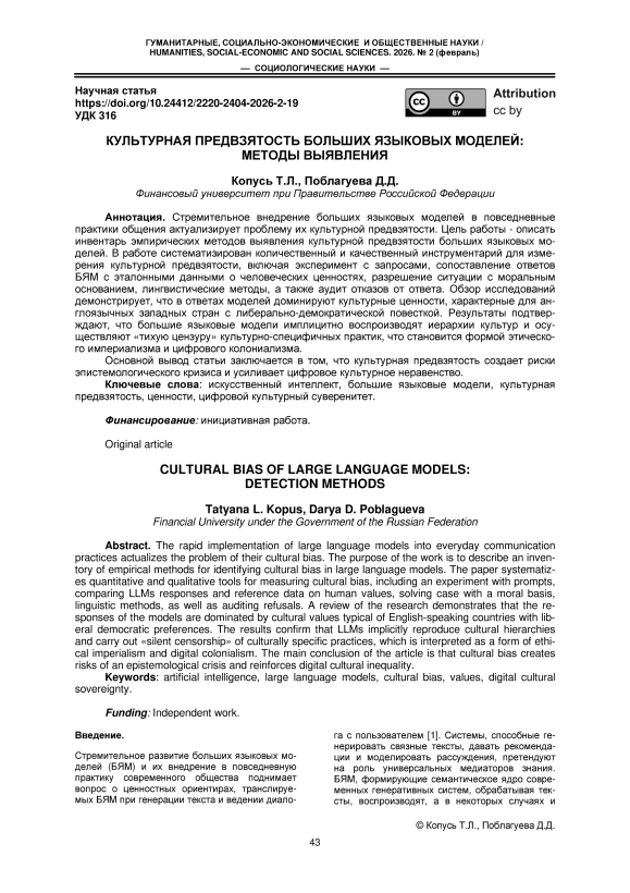 Искусственный интеллект, большие языковые модели, культурная предвзятость, ценности, цифровой культурный суверенитет