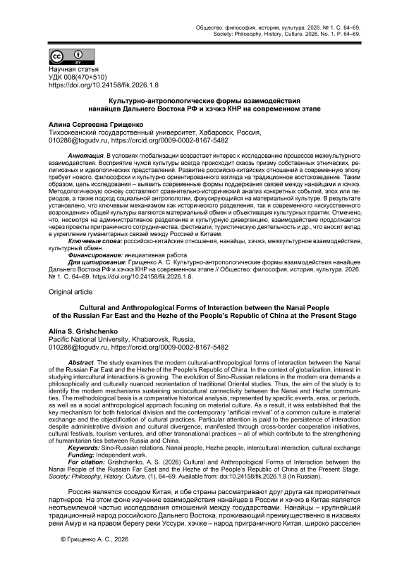 В условиях глобализации возрастает интерес к исследованию процессов межкультурного взаимодействия. Восприятие чужой культуры всегда происходит сквозь призму собственных этнических, религиозных и идеологических представлений. Развитие российско-китайских отношений в современную эпоху требует нового, философски и культурно ориентированного взгляда на традиционное востоковедение. Таким образом, цель исследования – выявить современные формы поддержания связей между нанайцами и хэчжэ. Методологическую основу составляют сравнительно-исторический анализ конкретных событий, эпох или периодов, а также подход социальной антропологии, фокусирующийся на материальной культуре. В результате установлено, что ключевым механизмом как исторического разделения, так и современного «искусственного возрождения» общей культуры являются материальный обмен и объективация культурных практик. Отмечено, что, несмотря на административное разделение и культурную дивергенцию, взаимодействие продолжается через проекты приграничного сотрудничества, фестивали, туристическую деятельность и др., что вносит вклад в укрепление гуманитарных связей между Россией и Китаем.
