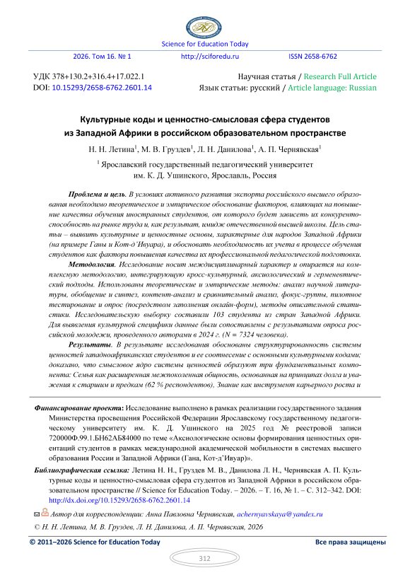 Проблема и цель. В условиях активного развития экспорта российского высшего образования необходимо теоретическое и эмпирическое обоснование факторов, влияющих на повышение качества обучения иностранных студентов, от которого будет зависеть их конкурентоспособность на рынке труда и, как результат, имидж отечественной высшей школы. Цель статьи – выявить культурные и ценностные основы, характерные для народов Западной Африки (на примере Ганы и Кот-д’Ивуара), и обосновать необходимость их учета в процессе обучения студентов как фактора повышения качества их профессиональной педагогической подготовки. Методология. Исследование носит междисциплинарный характер и опирается на комплексную методологию, интегрирующую кросс-культурный, аксиологический и герменевтический подходы. Использованы теоретические и эмпирические методы: анализ научной литературы, обобщение и синтез, контент-анализ и сравнительный анализ, фокус-группы, пилотное тестирование и опрос (посредством заполнения онлайн-форм), методы описательной статистики. Исследовательскую выборку составили 103 студента из стран Западной Африки. Для выявления культурной специфики данные были сопоставлены с результатами опроса российской молодежи, проведенного авторами в 2024 г. (N = 7324 человека). Результаты. В результате исследования обоснованы структурированность системы ценностей западноафриканских студентов и ее соотнесение с основными культурными кодами; доказано, что смысловое ядро системы ценностей образуют три фундаментальных компонента: Семья как расширенная межпоколенная общность, основанная на принципах долга и уважения к старшим и предкам (62 % респондентов), Знание как инструмент карьерного роста и сохранения культурной идентичности, Коллективизм как значимость общинности (57 % респондентов); выявлена тенденция трансформации иерархии ценностей западноафриканских студентов под влиянием академической мобильности при сохранении базовых культурных кодов; при сравнении с российской молодежью обнаружен ценностный парадокс: при формальном совпадении набора базовых ценностей с российскими студентами (семья, образование, успех) их культурное наполнение и иерархия кардинально различаются. Полученные результаты необходимо учитывать в процессе педагогического образования для его персонализации и повышения его качества Заключение. В результате проведенного теоретического и эмпирического исследования выявлена структура ценностей западноафриканских студентов и ее связь с культурными традициями стран континента. Авторы приходят к выводу, что понимание особенностей культуры и системы ценностей оказывает положительное влияние на адаптацию и процесс образования западноафриканских студентов, а также на обогащение образовательной среды российских вузов.
