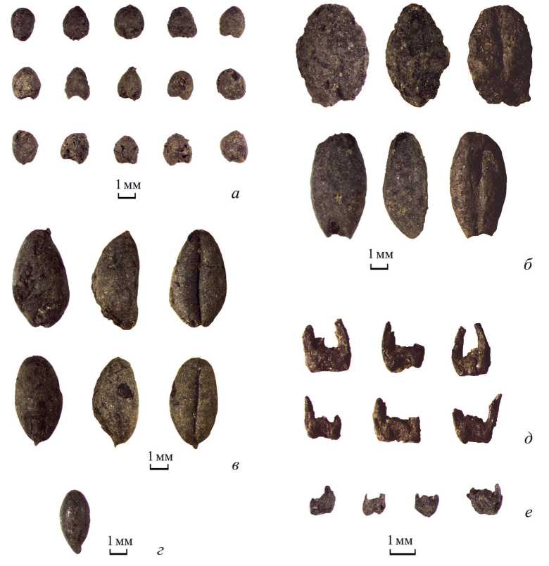 Рис. 1. Археоботанические макроостатки а – зерновки проса обыкновенного; б – зерновки ячменя; в – зерновки двузернянки; г – семя льна; д – колосковые вилочки из средней и нижней частей колоса двузернянки; е – колосковые вилочки двузернянки из верхней части колоса послеуборочных стадий очистки урожая – например, при значительном числе вилочек и оснований чешуй отсутствуют основания колоса двузернянки (место, где колос переходит в соломину), также нет ни одного колосового фрагмента ячменя. Кроме того, зафиксировано низкое содержание семян сорных таксонов (всего 15 %) и недозрелых зерновок проса (3 % от всего проса), что скорее характерно для поселений-потребителей. Однако выборка образцов, как и исследованная площадь дьяковского слоя, слишком мала, чтобы экстраполировать полученные данные на все поселение.