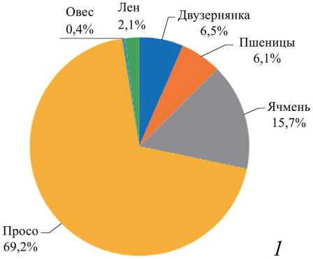 порой значительно. Похожая ситуация наблюдается и в Новгороде Великом ( Кирьянов , 1959). На сельских памятниках картина более сложная, однако даже для северных областей Древней Руси, где ячмень, вероятно, имел большое значение, к XII–XIII вв. рожь вытесняет его с первой позиции, а двузернянка не обнаружена вовсе ( Макаров и др. , 1998. С. 181). Лишь на нескольких селищах Суздальского Ополья в это время наблюдается заметное присутствие двузернянки, ячменя и проса, но все же при лидировании в спектрах ржи и овса ( Лебедева , 2023). В рассматриваемых здесь шести образцах отсутствует рожь, имеется всего одно зерно овса (которое, вероятнее всего, имеет средневековое происхождение), а мягкая пшеница занимает лишь незначительную часть спектра.