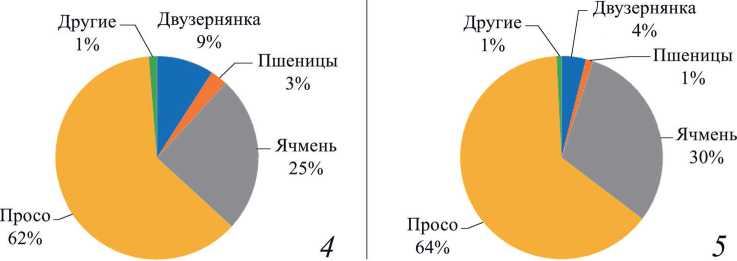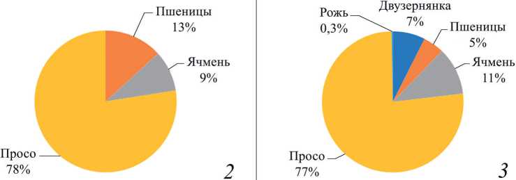 Доминирование проса отмечено также на всем протяжении существования Ростиславльского городища (и в раннедьяковском, и в позднедьяковском периодах) (рис. 2: 4, 5 ).