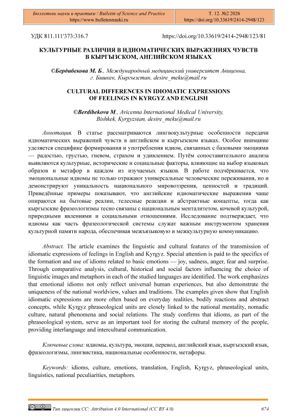 В статье рассматриваются лингвокультурные особенности передачи идиоматических выражений чувств в английском и кыргызском языках. Особое внимание уделяется спецификe формирования и употребления идиом, связанных с базовыми эмоциями — радостью, грустью, гневом, страхом и удивлением. Путём сопоставительного анализа выявляются культурные, исторические и социальные факторы, влияющие на выбор языковых образов и метафор в каждом из изучаемых языков. В работе подчёркивается, что эмоциональные идиомы не только отражают универсальные человеческие переживания, но и демонстрируют уникальность национального мировоззрения, ценностей и традиций. Приведённые примеры показывают, что английские идиоматические выражения чаще опираются на бытовые реалии, телесные реакции и абстрактные концепты, тогда как кыргызские фразеологизмы тесно связаны с национальным менталитетом, кочевой культурой, природными явлениями и социальными отношениями. Исследование подтверждает, что идиомы как часть фразеологической системы служат важным инструментом хранения культурной памяти народа, обеспечивая межъязыковую и межкультурную коммуникацию.