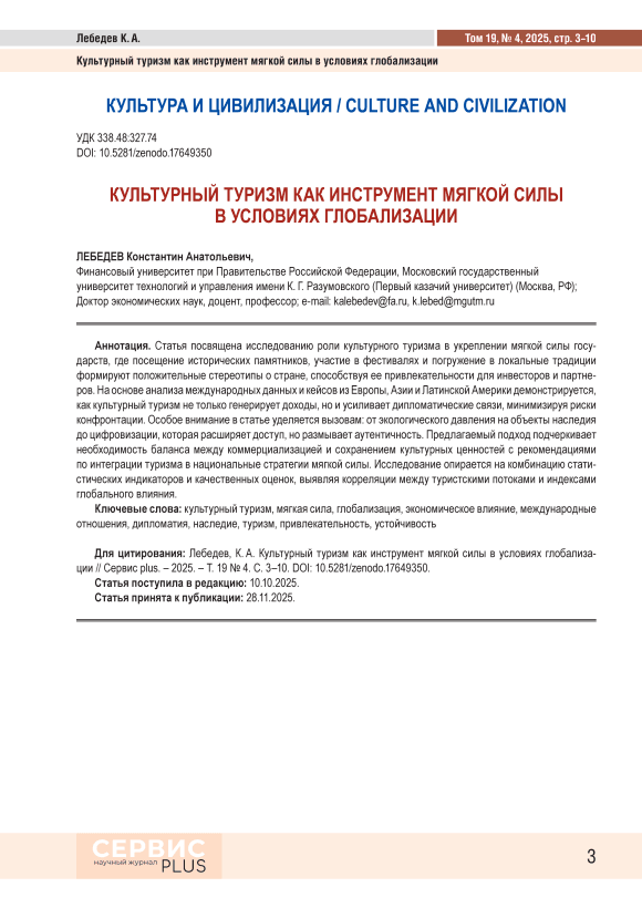 Статья посвящена исследованию роли культурного туризма в укреплении мягкой силы государств, где посещение исторических памятников, участие в фестивалях и погружение в локальные традиции формируют положительные стереотипы о стране, способствуя ее привлекательности для инвесторов и партнеров. На основе анализа международных данных и кейсов из Европы, Азии и Латинской Америки демонстрируется, как культурный туризм не только генерирует доходы, но и усиливает дипломатические связи, минимизируя риски конфронтации. Особое внимание в статье уделяется вызовам: от экологического давления на объекты наследия до цифровизации, которая расширяет доступ, но размывает аутентичность. Предлагаемый подход подчеркивает необходимость баланса между коммерциализацией и сохранением культурных ценностей с рекомендациями по интеграции туризма в национальные стратегии мягкой силы. Исследование опирается на комбинацию статистических индикаторов и качественных оценок, выявляя корреляции между туристскими потоками и индексами глобального влияния.
