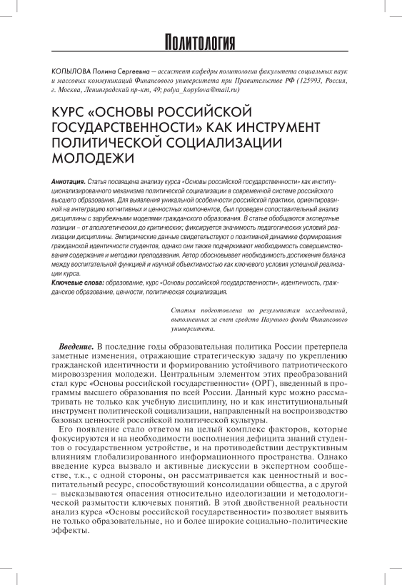 Курс «Основы российской государственности» как инструмент политической социализации молодежи