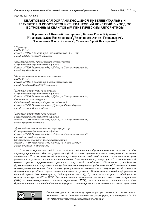 В задачах управления, поддержка свойства робастности функционирования сложного, слабо структурированного объекта управления (ОУ) за счет применения интеллектуальной системы управления (ИСУ) и технологий интеллектуальных вычислений, необходима для достижения цели управления в условиях риска и непредвиденных (или нештатных) ситуаций. С алгоритмической точки зрения эффективное решение актуальной проблемы обеспечения устойчивого функционирования ОУ в условиях неопределенности и сохранения робастности ИСУ означает, что в используемом алгоритме достижения цели управления выполняются следующие необходимые и достаточные (в общем случае антагонистические) условия: 1) минимум исходной информации о внешней среде (или возмущение, действующее на ОУ); 2) минимальный расход обобщенного полезного ресурса в ОУ и ИСУ. Рассматривается применение квантовых поисковых алгоритмов (КПА) в интеллектуальных системах управления (ИСУ), т.е. в системах, которые способны функционировать в непредвиденных ситуациях с гарантированным достижением цели управления (свойство робастности). Разработана интеллектуальная технология (ИТ) проектирования робастных баз знаний (БЗ) с применением квантовых эффектов самоорганизации в условиях непредвиденных ситуаций управления и риска. Описываются принципы построения, структура и практическое применение разработанной ИТ проектирования робастных БЗ в ИСУ, эффективно и надежно функционирующих в условиях риска и непредвиденных ситуаций управления на основе модели самоорганизации БЗ. Результат разработки заключается в обеспечении гарантированного достижения цели управления в непредвиденных (нештатных) ситуациях управления в реальном времени, как следствие применения квантового генетического алгоритма (КГА) управления в структуре самоорганизующейся ИСУ. Приведены примеры эффективного моделирования самоорганизации робастных БЗ в ИСУ динамически (глобально или локально) неустойчивыми существенно-нелинейными ОУ.