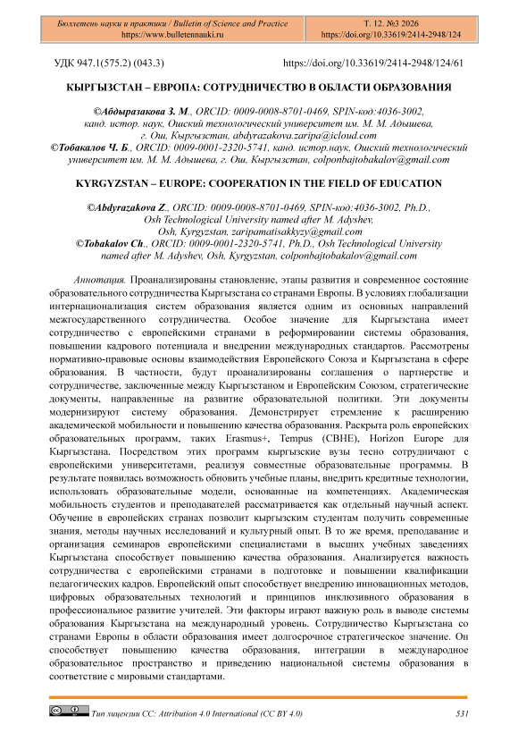 Проанализированы становление, этапы развития и современное состояние образовательного сотрудничества Кыргызстана со странами Европы. В условиях глобализации интернационализация систем образования является одним из основных направлений межгосударственного сотрудничества. Особое значение для Кыргызстана имеет сотрудничество с европейскими странами в реформировании системы образования, повышении кадрового потенциала и внедрении международных стандартов. Рассмотрены нормативно-правовые основы взаимодействия Европейского Союза и Кыргызстана в сфере образования. В частности, будут проанализированы соглашения о партнерстве и сотрудничестве, заключенные между Кыргызстаном и Европейским Союзом, стратегические документы, направленные на развитие образовательной политики. Эти документы модернизируют систему образования. Демонстрирует стремление к расширению академической мобильности и повышению качества образования. Раскрыта роль европейских образовательных программ, таких Erasmus+, Tempus (СВНЕ), Horizon Europe для Кыргызстана. Посредством этих программ кыргызские вузы тесно сотрудничают с европейскими университетами, реализуя совместные образовательные программы. В результате появилась возможность обновить учебные планы, внедрить кредитные технологии, использовать образовательные модели, основанные на компетенциях. Академическая мобильность студентов и преподавателей рассматривается как отдельный научный аспект. Обучение в европейских странах позволит кыргызским студентам получить современные знания, методы научных исследований и культурный опыт. В то же время, преподавание и организация семинаров европейскими специалистами в высших учебных заведениях Кыргызстана способствует повышению качества образования. Анализируется важность сотрудничества с европейскими странами в подготовке и повышении квалификации педагогических кадров. Европейский опыт способствует внедрению инновационных методов, цифровых образовательных технологий и принципов инклюзивного образования в профессиональное развитие учителей. Эти факторы играют важную роль в выводе системы образования Кыргызстана на международный уровень. Сотрудничество Кыргызстана со странами Европы в области образования имеет долгосрочное стратегическое значение. Он способствует повышению качества образования, интеграции в международное образовательное пространство и приведению национальной системы образования в соответствие с мировыми стандартами.