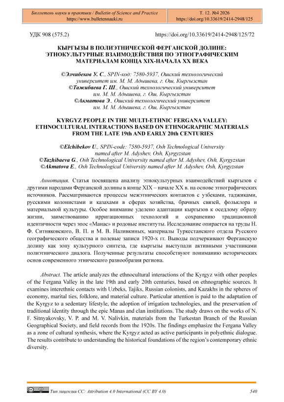 The article analyzes the ethnocultural interactions of the Kyrgyz with other peoples of the Fergana Valley in the late 19th and early 20th centuries, based on ethnographic sources. It examines interethnic contacts with Uzbeks, Tajiks, Russian colonists, and Kazakhs in the spheres of economy, marital ties, folklore, and material culture. Particular attention is paid to the adaptation of the Kyrgyz to a sedentary lifestyle, the adoption of irrigation technologies, and the preservation of traditional identity through the epic Manas and clan institutions. The study draws on the works of N. F. Sitnyakovsky, V. P. and M. V. Nalivkin, materials from the Turkestan Branch of the Russian Geographical Society, and field records from the 1920s. The findings emphasize the Fergana Valley as a zone of cultural synthesis, where the Kyrgyz acted as active participants in polyethnic dialogue. The results contribute to understanding the historical foundations of the region’s contemporary ethnic diversity.