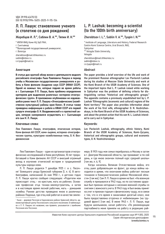 В середине 1950-х гг. Л. П. Лашук совместно с Л. Н. Жеребцовым инициировал академическую программу этнографического районирования всей территории Коми АССР, которая осуществлялась впоследствии сыктывкарскими этнографами вплоть до начала 1990-х гг. Свои принципы историко-этнографического районирования Коми АССР Л. П. Лашук изложил в публикациях 1960 г. [27; 28]. А первым опытом комплексной характеристики одного из этнографических районов на территории расселения коми стала обстоятельная работа Л. П. Лашука «Сысольский этнографический район Коми АССР», включенная в качестве приложения в отчет Сысольской этнографической экспедиции 1958 г. [29]. Этот труд долгое время оставался неопубликованным и лишь осенью 2025 г. подготовлен В. Э. Шараповым и И. Л. Жеребцовым к изданию в журнале «Этнография».