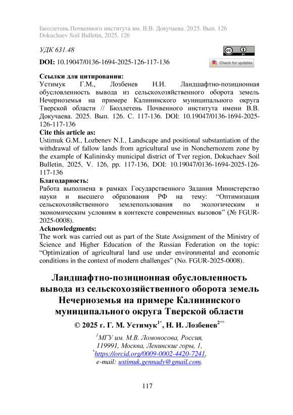 Ландшафтно-позиционная обусловленность вывода из сельскохозяйственного оборота земель Нечерноземья на примере Калининского муниципального округа Тверской области