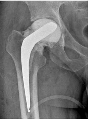 Рис. 9. Рентгенограмма правого тазобедренного сустава пациента К. через 12 мес. после операции тотального эндопротезирования левого тазобедренного сустава