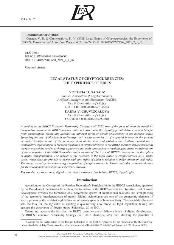 Текст статьи LEGAL STATUS OF CRYPTOCURRENCIES: THE EXPERIENCE OF BRICS