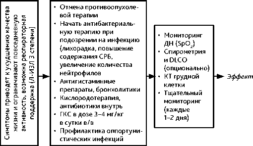 Рекомендации по лечению ИБЛ/пульмонита, связанного с применением ингибиторов контрольных точек — см. соответствующий раздел по управлению иммуноопосредован- ными нежелательными явлениями (стр. 271–329).