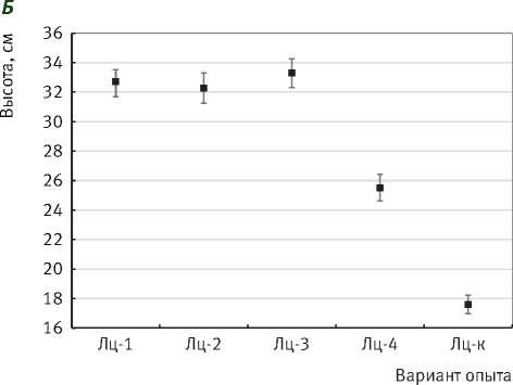 Рис. 2. Статистическая оценка роста сеянцев лиственницы сибирской: а – диаметр у шейки корня, мм; б – высота, см показателям высокая. Достоверность средних значений – более 3 (от 10,2 до 34,4), т.е. оцениваемые показатели являются достоверными и могут использоваться для сопоставлений и выводов.