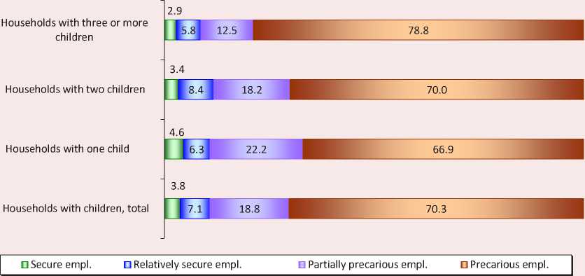 Secure employment distinguishes households with fulfilled labor potential, in which all members aged 15 years old and over are working, while jobs are secure, which ensures economic resilience of households. Their share among households with children in general is only 3.8% ( Fig. 1 ). When considered by household type, the proportion of those characterized by secure employment