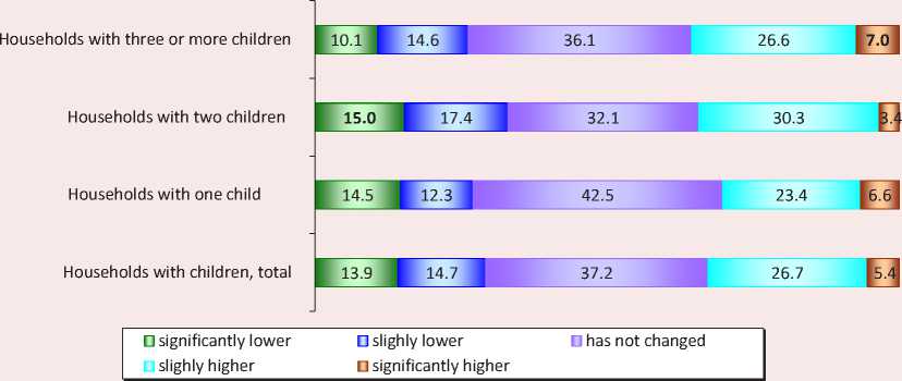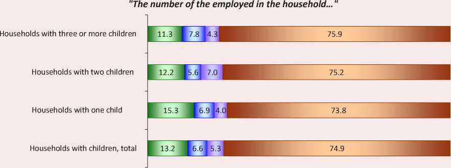 example, a newborn child) and working age (for example, a disabled person) could require care. These changes in the employment situation have occurred in 8.5% of households with one child, in 11.3% of families with two children, and in 11.4% of large families. In some households (9.8%), the opposite situation was observed – one of the household members has got a job or started business. The largest number of such households are among large families (13.9%), among families with one child their share is 10.2%, and among families with two children – 7.4%.