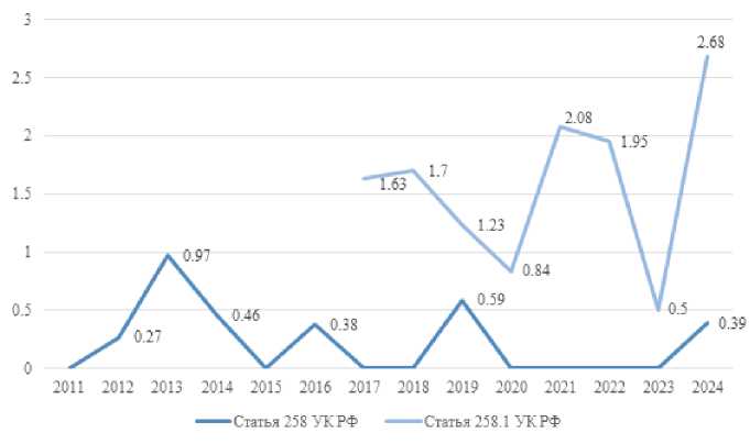 Рис. 2. Удельный вес женщин, осужденных за совершение преступлений, предусмотренных ст. 258 УК РФ (% от общего числа осужденных в Российской Федерации)