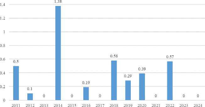 Гендерная характеристика. В изученных решениях к уголовной ответственности по ст. 258 УК РФ в обоих федеральных округах привлекались мужчины. Полученный результат подтверждается судебной статистикой Забайкальского края, Новосибирской области и Республики Тыва. Тем не менее в литературе описывается участие женщин в незаконной охоте, например содействие в транспортировке добытых животных [3, с. 151; 13, с. 325–326; 16, с. 98; 17, с. 165]. Имеющийся в публикациях разброс значений составляет от 1 до 4 % [2, с. 90; 5, с. 109; 18, с. 394; 19, с. 627], что, вероятно, обусловлено особенностями выборки. Доля женщин, осужденных за незаконную охоту в России за 2011–2024 гг., колеблется в диапазоне от 0 до 1,38 % (рис. 2).