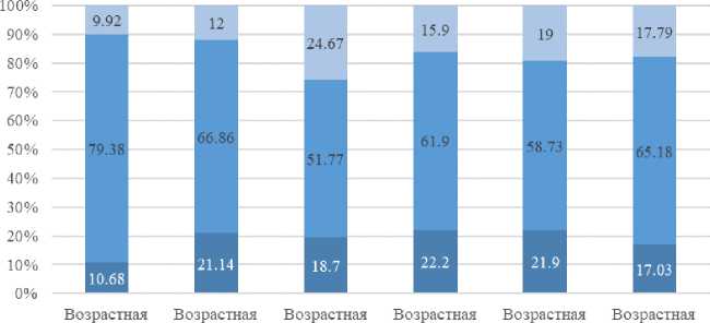 профессиональное – от 18,5 до 31,2 %; среднее общее – от 25 до 55,8 %; основное общее, начальное, нет образования – от 21,1 до 39 % [2, с. 90; 3, с. 52; 5, с. 110; 13, с. 326; 17, с. 166; 18, с. 394].