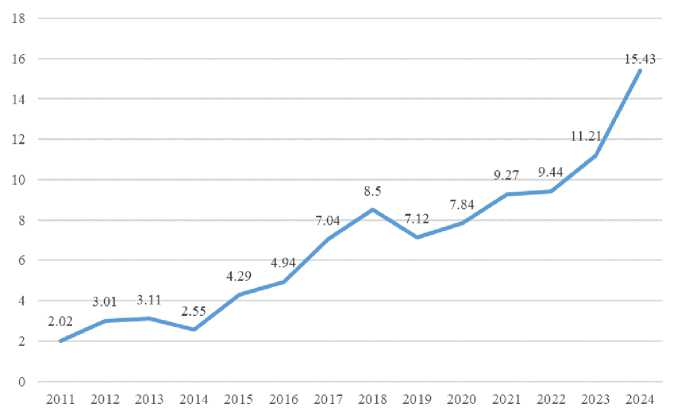 Рис. 4. Количество лиц в возрасте 60 лет и старше, совершивших преступление, предусмотренное ст. 258 УК РФ, и впоследствии осужденных в 2011–2024 гг. (% от общего числа осужденных по ст. 258 УК РФ в России)