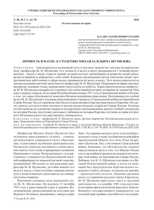 Анализируются жизненный путь и научное творчество доктора исторических наук, профессора М. И. Шумилова. Его личность и вклад в науку раскрываются с позиций науковедения – науки о науке, отрасли знаний, которая изучает закономерности развития самой науки, является формой ее рефлексии о себе самой. В рамках науковедения дается типология людей, профессионально работающих в сфере науки, оценивается их вклад в науку. Этот подход используется при рассмотрении научной деятельности профессора М. И. Шумилова. Раскрываются сферы научных интересов, основные этапы, направления и результаты его работы. Характеризуется вклад профессора М. И. Шумилова в разработку ключевых тем отечественной истории, которыми он занимался. Речь идет в первую очередь об истории Российской революции 1917 года и Гражданской войны в России, о том, что ныне объединяется понятием Великая российская революция. Подчеркивается особый вклад М. И. Шумилова в изучение революционного процесса и Гражданской войны на Европейском Севере России. Под его руководством была создана авторитетная научная школа в Карелии. Он сделал многое для подготовки научных и научно-педагогических кадров на Севере России. Отмечен его большой вклад в развитие северного исторического регионоведения, выпуск учебной литературы по истории России, подготовку школьных учебников по истории Карелии, изучение истории его родного Петрозаводского государственного университета.