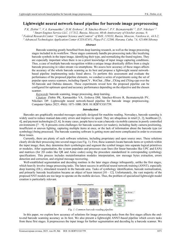 Lightweight neural network-based pipeline for barcode image preprocessing