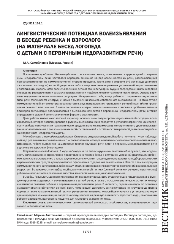 Statement of the problem. Interaction with native speakers, who belong to the group of children with primary speech underdevelopment, makes us pay attention to a number of features of their speech, which are revealed when focusing on the communicative side of the process. During dialogues with an adult (speech therapist) on a free topic or during speech exercises, such 5-9-year-old children are not inclined to explicate the modality of volition and do it irregularly, being focused primarily on unfolding the idea of the utterance and selecting lexico-grammatical forms. However, variants of the expression of will are regularly detected when children with primary speech underdevelopment face difficulties in expressing the intention of their own utterance – in this case, the communicative act can unfold in two directions: the manifestation of speech will and / or the manifestation of speech negativism. In connection with the above, the problems of analyzing examples of explication of volition in the statements of children with primary speech underdevelopment, as well as determining the conditions of volition and the forms of its explication, become heuristically significant. The purpose of the study is complex: to describe the semantic organization of the linguistic situation of volition, which is explicit in the Russian utterance and is created under conditions of limited ability to choose lexical and grammatical means; to identify the relationship between the constructive level of expressing volition with its communicative component and the features of speech activity of a child with primary speech underdevelopment. Methodology (materials and methods). The main results in this work were obtained by observing real statements using semantic-syntactic analysis and classification methods. The study is based on the texts of the sounding speech of children with primary speech underdevelopment in a dialogue with an adult (speech therapist). Research results. During observation of the analyzed texts, it was found that the modality of volition expression is limited in the texts of conversations in situations of successful realization of the utterance intention by a child; in this case, the main efforts of the speaker are aimed at selecting lexical and grammatical means for the adequate design of the content of the utterance. At the same time, in situations of communicative difficulty or communicative defeat, the number of volition expressions increases. Depending on the chosen communicative tactics (speech will or speech negativism), the child uses various ways of linguistic explication of volition. Conclusions. The results of this study make it possible to expand existing ideas about functioning of volition modality in oral speech, as well as about psycholinguistic aspects of communicative development of a child with primary speech underdevelopment. In particular, conclusions are drawn on their mastery of communicative tactics of verbal will, which helps them build a syntactic structure up to the limits of the norm, as well as on their communicative tactics of speech negativism, which is realized in attitudes towards denial of the communication process, prohibition of a certain topic, prohibition of adult speech activity, etc., helping a child to finish their conversation on a topic difficult in terms of linguistic expression.
