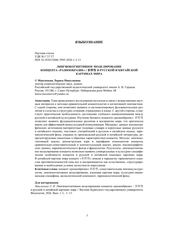 The topic of the study is relevant due to the growing scholarly interest in the methods of comparative conceptology and cognitive linguistics. On the one hand, these ap-proaches make it possible to identify and systematize fundamental differences and similarities in the structures of consciousness as reflected in language. On the other hand, there is a practical need to achieve deeper mutual understanding between the Russian and Chinese cultures. The study of the core concept diversity / 多样性 makes it possible to reveal fundamental differences in the perception of from lexicographic sources (authoritative explanatory dictionaries and corpus data from the Russian and Chinese languages), examples of textual usage in Russian and Chinese, the paremiolog-ical corpus (proverbs and sayings), and excerpts from works of Russian Chinese litera-ture representing the evaluative and figurative characteristics of the concept. Methods: linguo-cognitive analysis; reconstruction of the core and peripheral components of the concept; comparative and contrastive analysis; contextual analysis; and analysis of lexicographic data, the paremiological corpus, and phraseology. Results: Linguo-cognitive modeling of the concept made it possible to identify both universal and cul-ture-specific features of the concept in the Russian and Chinese linguistic worldviews. In the Chinese worldview, the concept 多样性 (diversity) is embedded within the para-digm if the harmonious unity of opposites (yin-yang) and is perceived as a natural, structed, and necessary condition for the integrity of the universe.