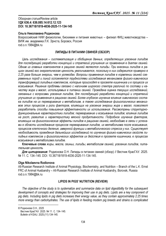 Цель исследования – систематизация и обобщение данных, определяющих усвоение липидов для последующей разработки концепций и стратегий улучшения их применения в диетах свиней. Одним из главных компонентов в рационе свиней являются липиды. При внесении липидов в рацион свиней его энергетическая ценность увеличивается, поскольку в них содержится примерно в 2,25 раза больше энергии, чем в углеводах. Вопросы применения липидов в кормлении свиней современных пород и линий осложняется трудностями исследования механизмов физикохимических трансформаций липидных комплексов, которые происходят в просвете кишечника и в процессе их всасывания. Решение проблемы связано с наличием широкого спектра различий по составу и качеству жира и масел, используемых в питании свиней. Проведена оценка текущих исследований, связанных с вопросами усвоения липидов, для последующей разработки концепций и стратегий улучшения их применения в рационах свиней. Более глубокое изучение влияния химического состава липидов на их переваривание и метаболизм, а также исследование физиологических механизмов этих процессов и роли факторов, влияющих на усвоение энергии жира и масел, позволяют разработать способы повышения эффективности их использования. Рассмотрены структурнофункциональные характеристики липидов; переваривание и всасывание липидов; влияние липидов на рост, развитие и характеристику мясной продуктивности. Подробное изучение факторов, влияющих на физиологические эффекты липидов в рационах свиней, необходимо в связи с успехами в области исследования процессов переваривания липидов, их метаболизма после всасывания, процессов клеточного деления, иммунной функции и метаболического стресса у них. Существует необходимость проведения дальнейших исследований по изучению физикохимических свойств липидных комплексов и физиологических эффектов их действия в просвете кишечника, в процессах всасывания и метаболизма липидов.