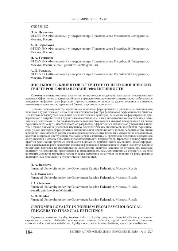 В статье рассматривается комплексная проблема формирования и управления лояльностью клиентов в туристической индустрии как ключевого фактора финансовой эффективности бизнеса. Исследование базируется на анализе психологических триггеров, влияющих на формирование приверженности потребителей к туристическим компаниям, и их взаимосвязи с экономическими показателями деятельности. Актуальность исследования обусловлена высокой конкуренцией на рынке туристических услуг и необходимостью разработки эффективных механизмов удержания клиентов. Особое внимание уделяется изучению психологических механизмов восприятия туристических услуг, факторов формирования эмоциональной привязанности и роли персонального опыта в развитии лояльности.В работе анализируются современные подходы к управлению лояльностью, включая цифровые инструменты взаимодействия с клиентами, программы персонализированного обслуживания и методы повышения удовлетворённости потребителей. Проведён анализ успешных практик реализации программ лояльности в ведущих туристических компаниях, демонстрирующих значительный рост повторных продаж и финансовой эффективности.Автор исследует влияние различных факторов на формирование лояльности, включая качество обслуживания, ценовую политику, уникальность предложения и эффективность коммуникационных стратегий. Особое внимание уделяется изучению поведенческих паттернов клиентов и их влияния на формирование долгосрочных отношений с туристической компанией.