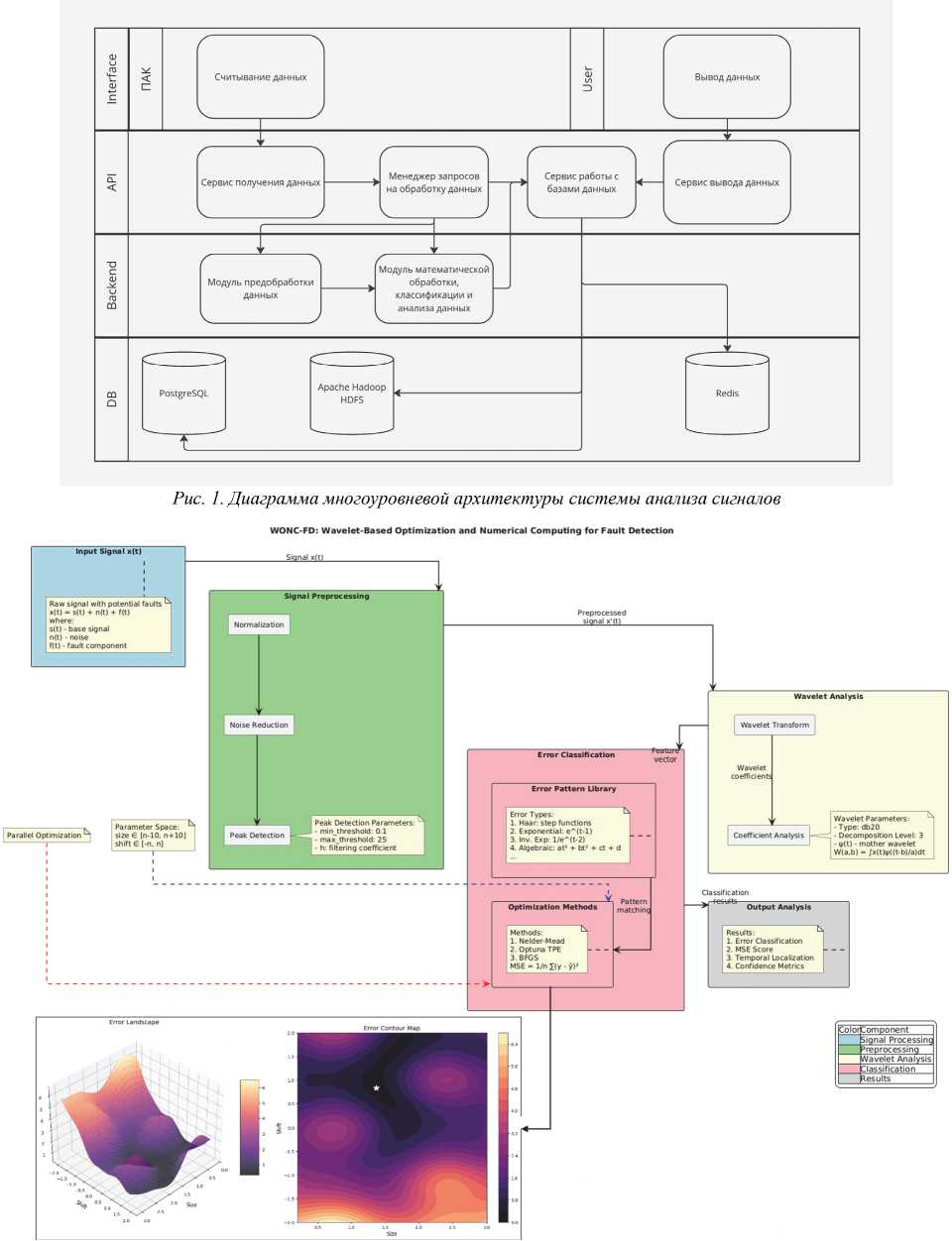 В рукописи представлены метод, алгоритмы, пример многоуровневой архитектуры информационной системы и результаты тестирования системы анализа сигналов на основе разработанного авторами алгоритма вейвлет-анализа, дополненного численными методами. Несмотря на достигнутые результаты, дальнейшие исследования могут быть направлены на повышение вычислительной эффективности, расширение библиотеки модельных ошибок, исследование робастности к параметрам и изучение альтернативных метрик качества классификации. Ключевыми преимуществами предложенной системы алгоритмов являются использование методов оптимизации и параллельных вычислений. Система демонстрирует потенциал для применения в различных областях обработки сигналов, где требуется автоматическое обнаружение и классификация аномалий или дефектов, таких как диагностика оборудования высокопроизводительных вычислительных кластеров или мониторинг сенсорных данных, являясь мощным и универсальным инструментом для анализа и интерпретации сложных сигнальных данных.