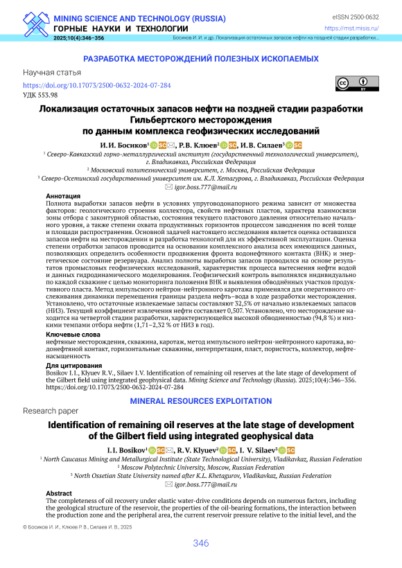 Локализация остаточных запасов нефти на поздней стадии разработки Гильбертского месторождения по данным комплекса геофизических исследований