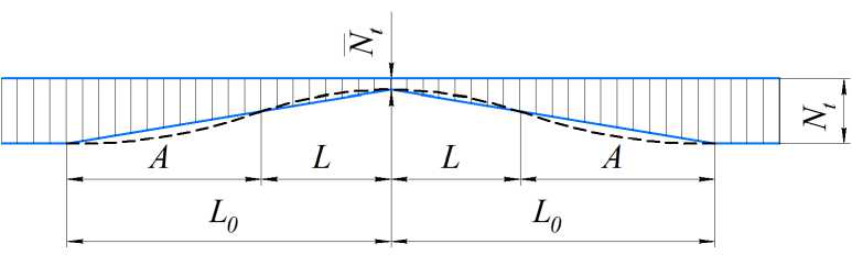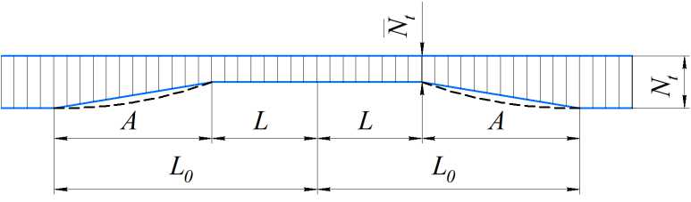 В данной работе предлагается модификация исходного решения из [7; 8] с учетом сопротивлений на всех участках гибкого стержня (рис. 2). При ограниченном расширении под действием температуры в стержне возникает сжимающая сила N t . На участке локальной потери устойчивости эта сжимающая сила уменьшается после деформации стержня и принимает значение N t . На рис. 2, а показан график изменения сжимающей силы в случае, когда продольным сопротивлением на участке с поперечными перемещениями пренебрегают [7]. На рис. 2, б показан график изменения сжимающей силы с учетом продольного сопротивления на всех участках. Величина силы N t – это параметр, перебором которого получаем решения. Графики на рис. 2 условные, величина A гораздо больше величины L , а сжимающая сила, строго говоря, изменяется нелинейно.