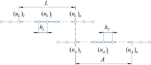 В этой системе каждое уравнение описывает продольные перемещения на одном участке стержня. При построении разностной схемы, на каждом из участков строится отдельная сетка (рис. 3). Количество узлов в каждой сетке одинаковое, длина участков различна и, соответственно, шаги сеток тоже разные. При записи разностных уравнений в каждой точке сеток, на каждом из участков появляются независимые законтурные узлы.