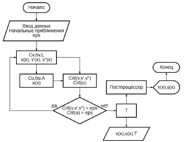 Достаточное количество узлов сетки определяется путем сравнения двух соседних решений. В качестве начального приближения принимается количество узлов n в шаблоне разностной аппроксимации. Если относительная разность площадей под графиками функций соседних решений не превышает наперед заданного значения ε , итерационный процесс поиска достаточного количества узлов останавливается. В противном случае увеличивается количество узлов сетки на количество узлов в разностном шаблоне. Значения функции между соседними значениями в узлах определяются линейной интерполяцией. Площадь под графиком вычисляется при помощи численного интегрирования методом трапеций. Такой критерий вычисляется для функций поперечного перемещения v и продольного перемещения u . А также для первой и второй производной функции v . Блок-схема алгоритма вычисления функций перемещения представлена на рис. 4.