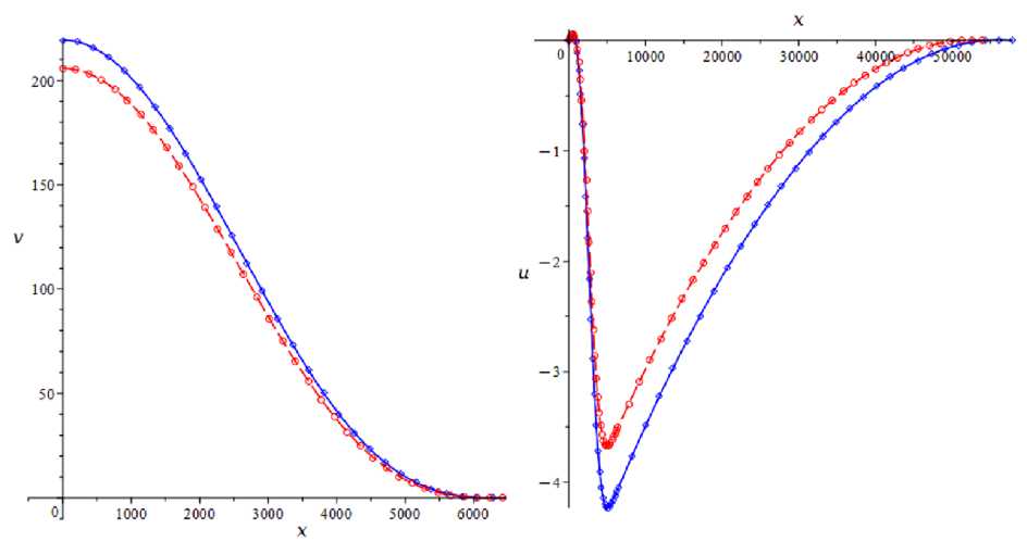 Графики поперечных и продольных перемещений сечений гибкого стержня при величине сжимающей силы N t = 882,9 кН приведены на рис. 5. Сплошной синей линией показаны функции перемещений, полученные в расчете 2, прерывистой красной линией – функции из расчета 3.
