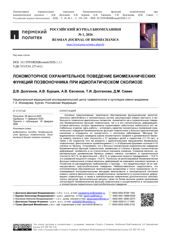 Согласно предположению, генетически обусловленная функциональная несостоятельность вегетативных и сенсомоторных систем, регулирующих осевую жесткость и мобильность позвоночнодвигательных сегментов, проявляется как в охранительном поведении биомеханических функций позвоночника, так и в его сколиотических деформациях, угловые величины которых механически ограничивают избыточную мобильность его нестабильных отделов. Цель работы – установить характер локомоторных проявлений охранительного поведения биомеханических функций позвоночника у больных идиопатическим сколиозом и определить их причастность к патогенезу заболевания. Методом 3Dвидеоанализа походки проведена оценка локомоторного профиля и динамического баланса осевого скелета в трех плоскостях у 37 здоровых детей и подростков (11–18 лет), а также у 82 пациентов того же возраста с идиопатическими нарушениями биомеханики позвоночника, фенотипически проявляющимися С и Sобразными формами сколиоза II–IV степени по Чаклину. Установлено, что у больных локомоторное охранительное поведение биомеханических функций позвоночника, независимо от степени и формы сколиотических деформаций, проявилось в их статистически значимом снижении. Снижение величин, характеризующих динамические балансы осевого скелета, составило: в горизонтальной плоскости 34,3 %, во фронтальной – 26,0 %, в привычной скорости передвижения – 10,8 % и в суммарной мощности походки –13,8 %. Поскольку на регистрируемые биомеханические функции позвоночника угловые величины деформаций не оказывали значимого влияния, а стохастика их распределения приближалась к гауссову, – это свидетельствует об их преимущественно приспособительном поведении. Небезосновательно предположить, что онтогенетически обусловленный генетическими аномалиями и почти прижизненно не отслеживаемый инструментальными методами вегетативный и сенсомоторный патогенез осевого скелета фенотипически и морфологически проявляется в сколиотических деформациях позвоночника, а также в компенсаторном привлечении дополнительных сенсомоторных ресурсов. Дополнительные ресурсы также на более высоком уровне организации контролируют биомеханические функции позвоночника и осуществляются в постуральном и локомоторном охранительноприспособительном поведении.