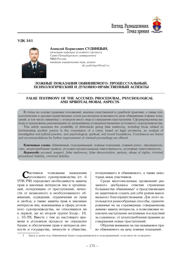 Текст научной статьи Ложные показания обвиняемого: процессуальный, психологический и духовно-нравственный аспекты