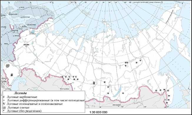 Объект исследования – луговые почвы на Почвенной карте РСФСР 1988 г. В легенде карты они представлены пятью единицами, ареалы которых локальны (рис. 1). В статье не рассматриваются “луговые” варианты зональных почв (например, луговочерноземные).