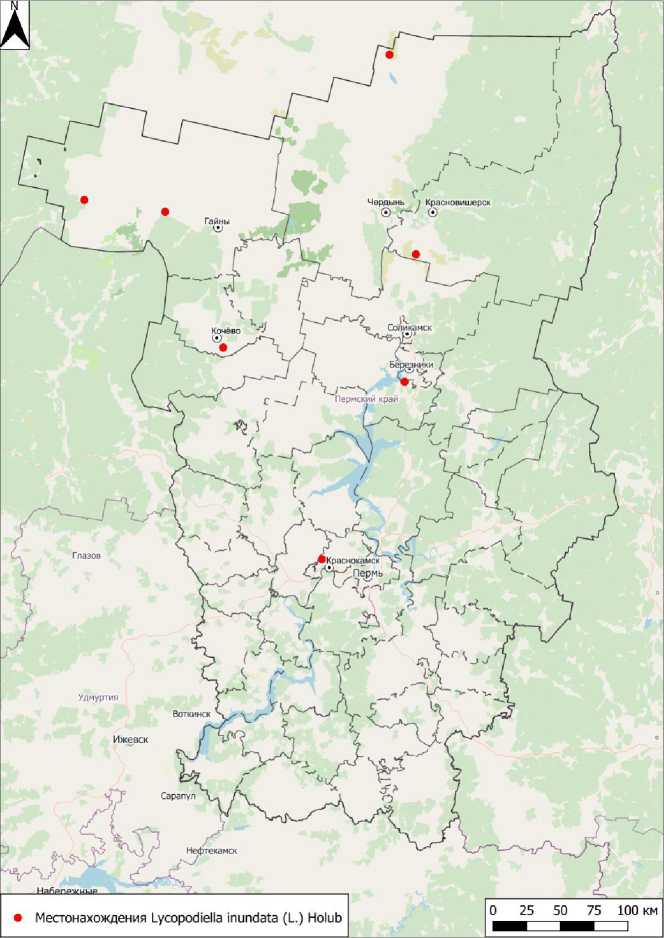 Таким образом, в настоящее время на территории Пермского края известно 7 подтвержденных местонахождений Lycopodiella inundata (рис. 2), преимущественно на среднетаежных территориях, в южной тайге местонахождения единичны.