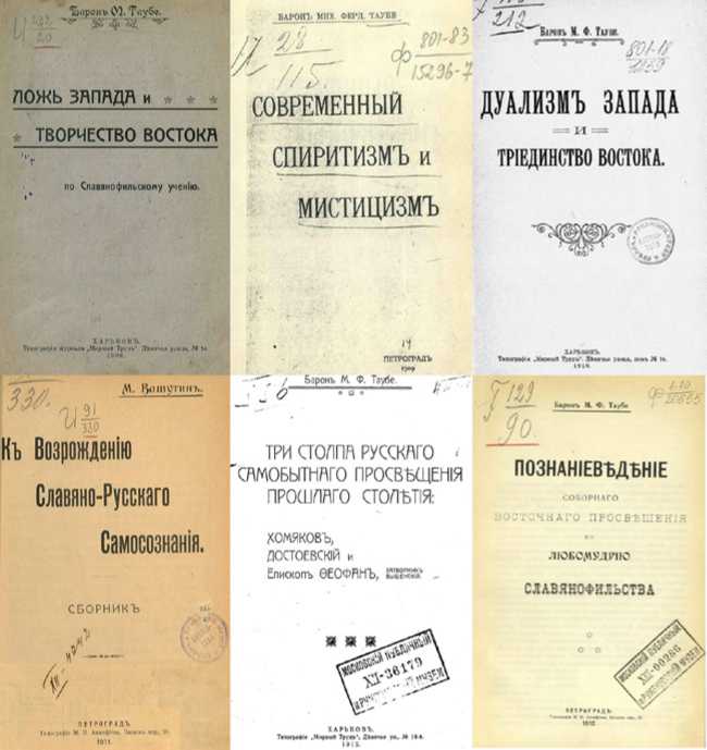 М. Ф. Таубе о России и Западе. Ряд работ М. Ф. Таубе посвящен проблеме взаимоотношения России и Запада. При этом мыслитель неуклонно выступал как почвенник, ссылаясь на труды А. С. Хомякова и Ф. М. Достоевского, других предшественников. В своей работе «Дуализм Запада и триединство Востока»86 он определил коренные различия западной и восточной цивилизаций. В его понимании, Запад, увлекшись идеей прогресса, сосредоточился на следующих идеях: юридизм (под которым барон понимает личностное и общественное правовое начало), индивидуализм («сепаратное и эгоистическое партийное начало») и прозелитизм (или культуртрегерство), под которым философ понимал насильственное внедрение западной культуры и мировоззрения другим народам87. Совершенно иными идеалами, по Таубе, живет мир Востока (к которому он относит и русский народ). Главные начала «восточного просвещения», как отмечает мыслитель, состоят в личном и политическом «служении» одного народа на благо соплеменных, а нередко и иноплеменных народов (в качестве примера барон приводит жизнь Российской империи), а также соборность и духовное подвижничество88. Как пишет Таубе, в свое время еще Достоевский обращал внимание на такое важное качество русских, как способность усваивать природу и дух других народов, «переваривать» их. Еще одно положительное, отличное от Запада качество русского народа — желание лучшей жизни, «жажда очищения и духовного подвига» — проистекает из осознания русскими своей греховности, несовершенства89.