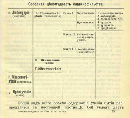 Таблица из книги М. Ф. Таубе «Познаниеведение соборного восточного просвещения по любомудрию славянофильства» (СПб., 1912. 230 с.)
