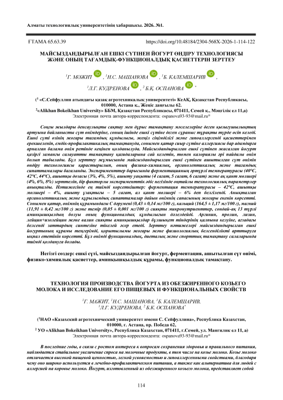 Соңғы жылдары денсаулықты сақтау мен дұрыс тамақтану мәселелеріне деген қызығушылықтың артуына байланысты сүт өнімдеріне, соның ішінде ешкі сүтіне деген сұраныс тұрақты түрде өсіп келеді. Ешкі сүті өзінің жоғары тағамдық құндылығы, жеңіл сіңімділігі және гипоаллергенді қасиеттерімен ерекшеленіп, емдік-профилактикалық тамақтануда, сонымен қатар сиыр сүтіне аллергиясы бар адамдарға арналған балама өнім ретінде кеңінен қолданылуда. Майсыздандырылған ешкі сүтінен жасалған йогурт қазіргі заманғы салауатты тамақтану қағидаларына сай келетін, төмен калориялы әрі пайдалы өнім болып табылады. Бұл зерттеу жұмысында майсыздандырылған ешкі сүтінен ашытылған сүт өнімін өндіру технологиясы қарастырылып, оның физика-химиялық, органолептикалық және тағамдық сипаттамалары бағаланды. Эксперименттер барысында ферментацияның әртүрлі температурасы (40℃, 42℃, 44℃), ашытқы дозасы (3%, 4%, 5%), ашыту уақыты (4 сағат, 5 сағат, 6 сағат) және ақ қант мөлшері (4%, 6%, 8%) зерттеліп, бір факторлы эксперименттік әдіс негізінде оңтайлы технологиялық параметрлер анықталды. Нәтижесінде ең тиімді көрсеткіштер: ферментация температурасы – 42℃, ашытқы мөлшері – 4%, ашыту ұзақтығы – 5 сағат, ал қант мөлшері – 6% деп белгіленді. Анықталған органолептикалық және құрылымдық сипаттамалар дайын өнімнің сапасының жоғары екенін көрсетті. Сонымен қатар, өнімнің құрамындағы С дәрумені (0,43 ± 0,14 мг/100 г), кальций (164,5 ± 1,17 мг/100 г), магний (11,91 ± 0,42 мг/100 г) және темір (0,05 ± 0,001 мг/100 г) сияқты микронутриенттер, сондай-ақ 13 түрлі аминқышқылдың болуы оның функционалдық құндылығын дәлелдейді. Аргинин, пролин, лизин, лейцин+изолейцин және валин сияқты аминқышқылдар бұлшықет тіндерінің қалпына келуіне, ағзадағы белсенді заттардың синтезіне тікелей әсер етеді. Зерттеу нәтижелері майсыздандырылған ешкі йогуртының құрамы теңгерімді, қорытылымы жоғары және физиологиялық белсенділікті арттыруға ықпал ететінін көрсетті. Бұл өнімді функционалдық, диеталық және спорттық тамақтану салаларында тиімді қолдануға болады.