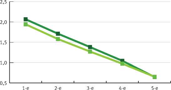 Формирование ширины годичного слоя древесины елей сибирской и европейской по 5-летиям возраста культур видов во II классе возраста. Однако между этими двумя видами выявлены существенные различия (см. табл. 4) в числе годичных слоёв в 1 см и содержании поздней древесины, что связано с их генетическими особенностями и различиями в ростовых стратегиях, закреплённых наследственно при формировании исходных насаждений в определённых климатических условиях.