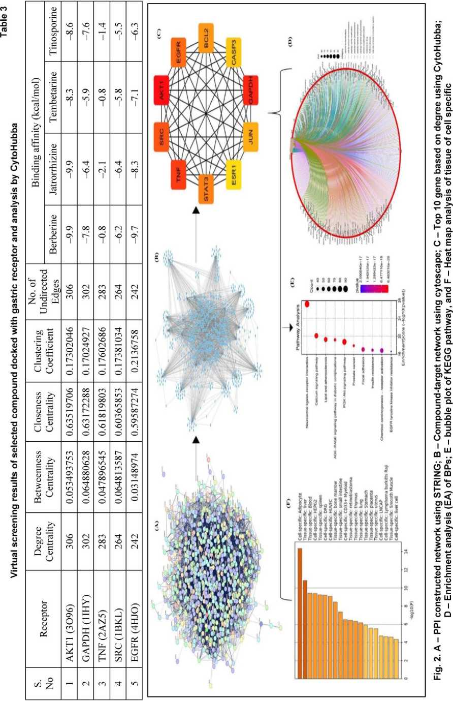 The berberine, jatrorrhizine, tembetarine and tinosporine were found to be non-hepatotoxic in a toxicity class ranging from 1 (toxic) to 6 (nontoxic). The NP approach identified berberine, jatrorrhizine, tembetarine, and tinosporine as the most relevant bioactive compounds by cytohubba plugin. It is important to note that the selection of these compounds for in silico analysis is strongly supported by extensive phytochemical literature [6, 7]. Thus, the computational predictions are grounded in the well-established chemical composition of the plant material. Toxicity in close proximity is thought to be more harmful to human health, and vice versa (Table 2). The ADME/Tox characteristics play a significant role in drug filtering throughout the early phases of drug development. We used ADME screening to identify bioactive chemicals that could be taken orally and that did not have any negative side effects, such as mutagenicity or allergenicity. Additionally, their primary targets were determined using the Swiss Target Prediction database based on the primary active chemicals. A total of 12,873 target genes were identified. Furthermore, 697 genes associated with gastric-intestinal disorder were obtained from OMIM and GeneCards databases (Fig. 1B).