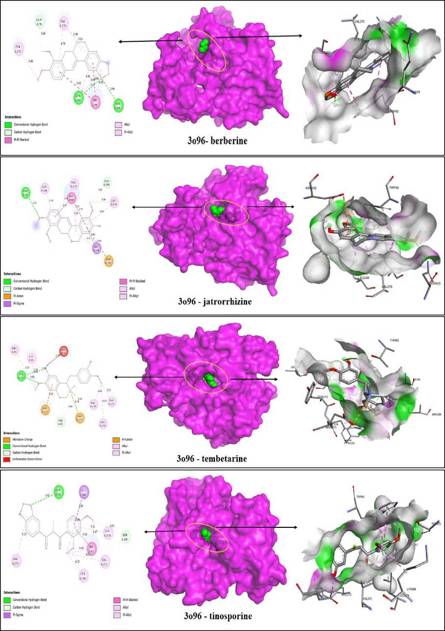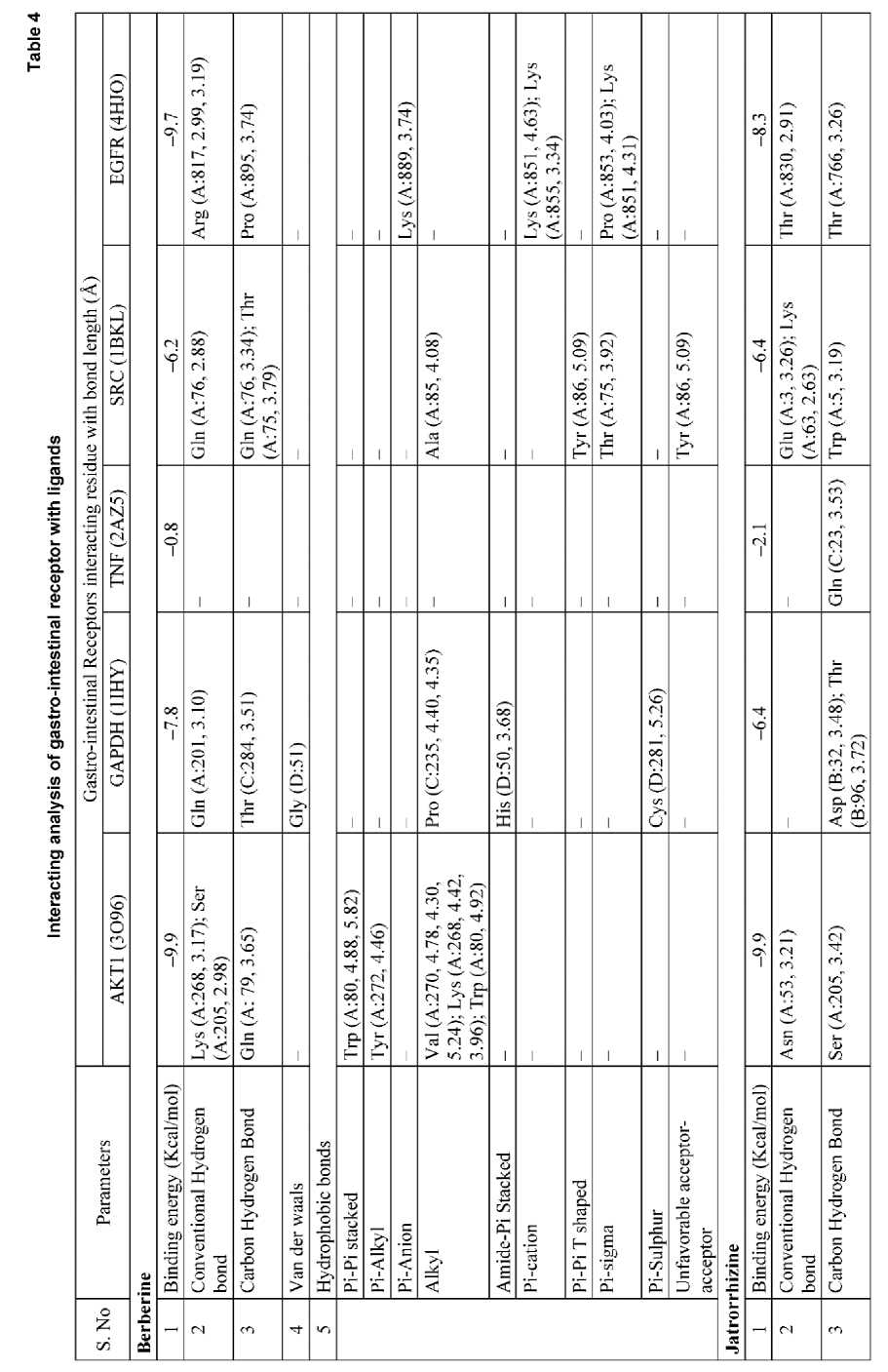ID: 3O96), GAPDH (PDB ID: 1IHY), TNF (PDB ID: 2AZ5), SRC (PDB ID: 1BKL), and EGFR (PDB ID: 4HJO) were retrieved from the RCSB database . The proteins were purify using AutoDock tools 1.5.6 (The Scripps Research Institute, La Jolla, CA, USA) by removing water and heteroatoms followed by addition of polar hydrogens for stabilization [8]. The Kollmann charges added to minimize the energy of protein. After energy reduction, the protein converted to PDBQT for molecular docking [9]. The ligand was prepared by converting SDF to PDB followed by PDBQT by adding Gasteiger charges using AutoDock Tools 1.5.6, using the same directory as the protein. The AutoDock Vina 1.2.5 (The Scripps Research Institute, La Jolla, CA, USA), command-line program, was used to finish the phytocompounds virtual screening [5]. The first binding pose was generated with zero atomic position root-mean square deviation (RMSD) is regarded as being exceptionally genuine out of 10. Additionally, it possesses the greatest binding affinity of all the positions, indicating a more efficient binding. Molecular docking visualized with Biovia Discovery Studio 2024 (Dassault Systèmes, Vélizy-Villacoublay, France). The total number of hydrogen bond (Hb), total count of intermolecular bonds, and binding affinity used to calculate the extent of ligand interaction [5].